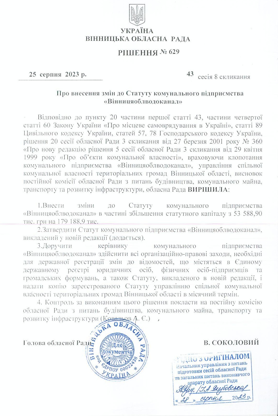 Про внесення змін до Статуту комунального підприємства "Вінницяоблводоканал"